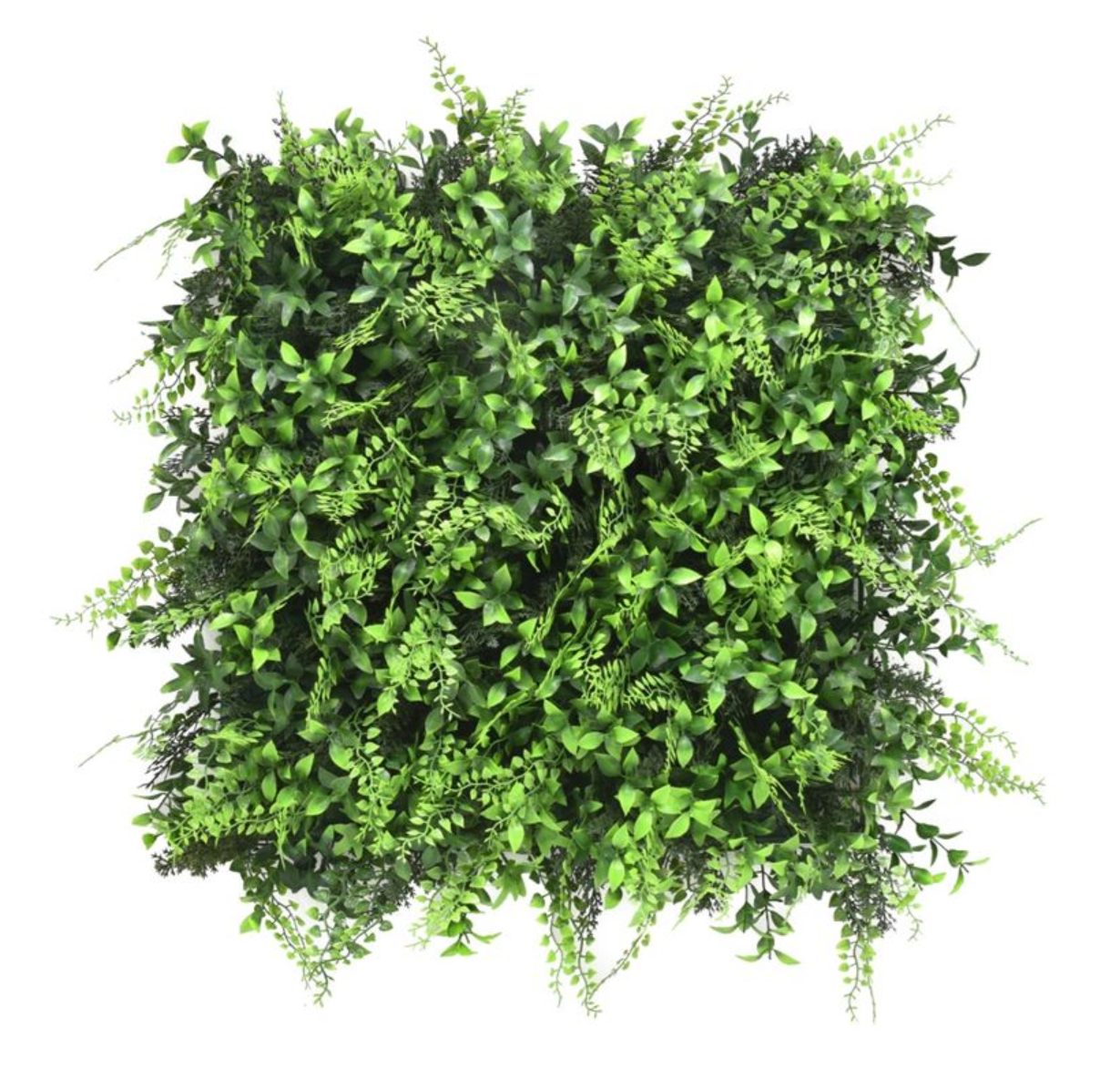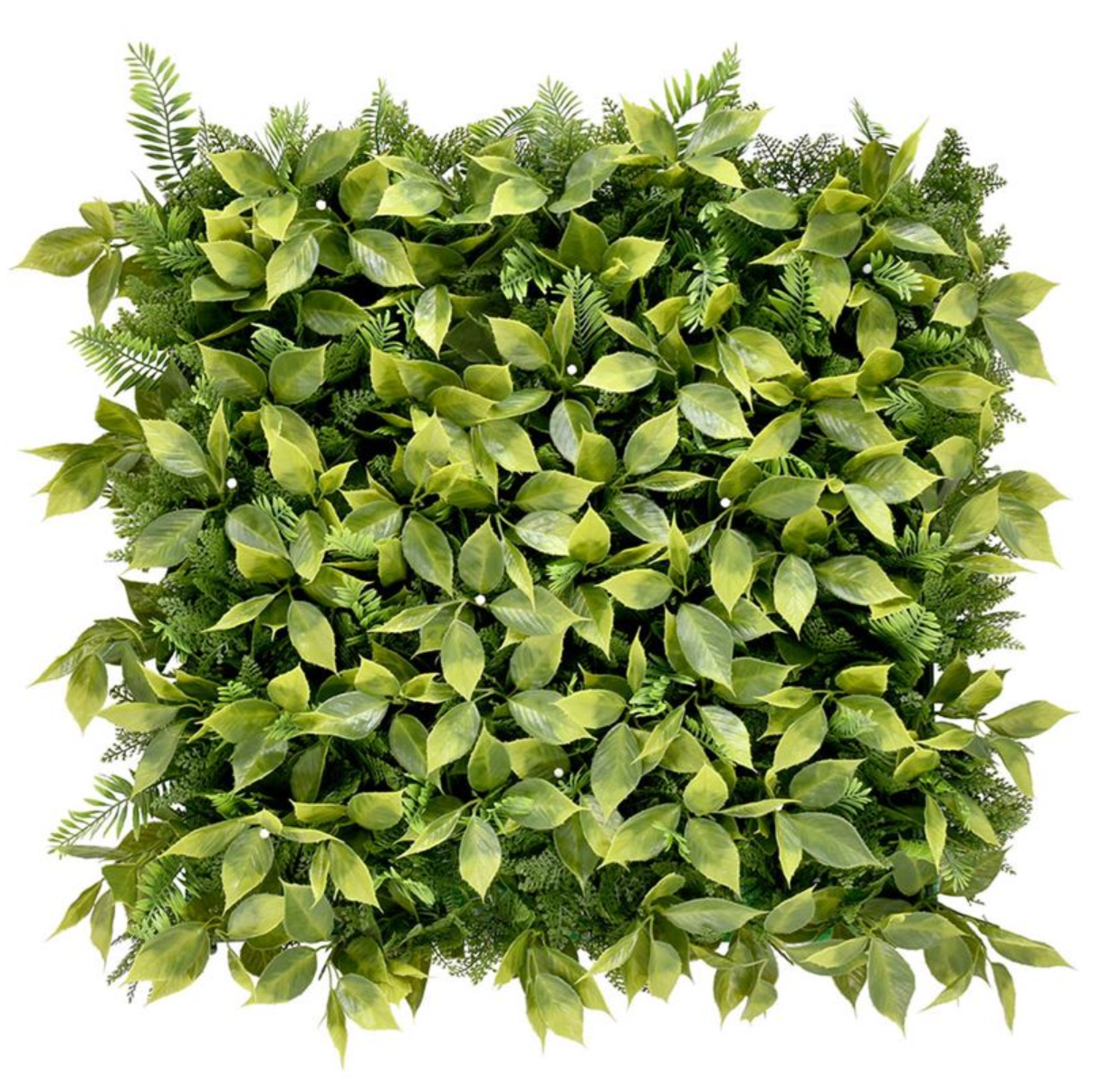 Synthetic decorative panel with dense foliage, in a tile size of 0.50m x 0.50m. It provides a sense of vitality and naturalness to your space. Decorate your outdoor or indoor area with foliage panels and create a unique vertical garden.