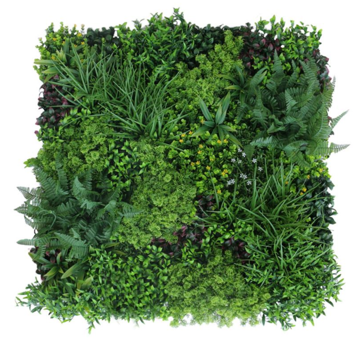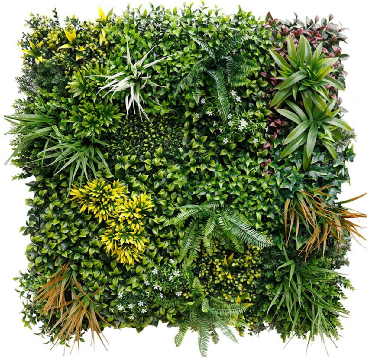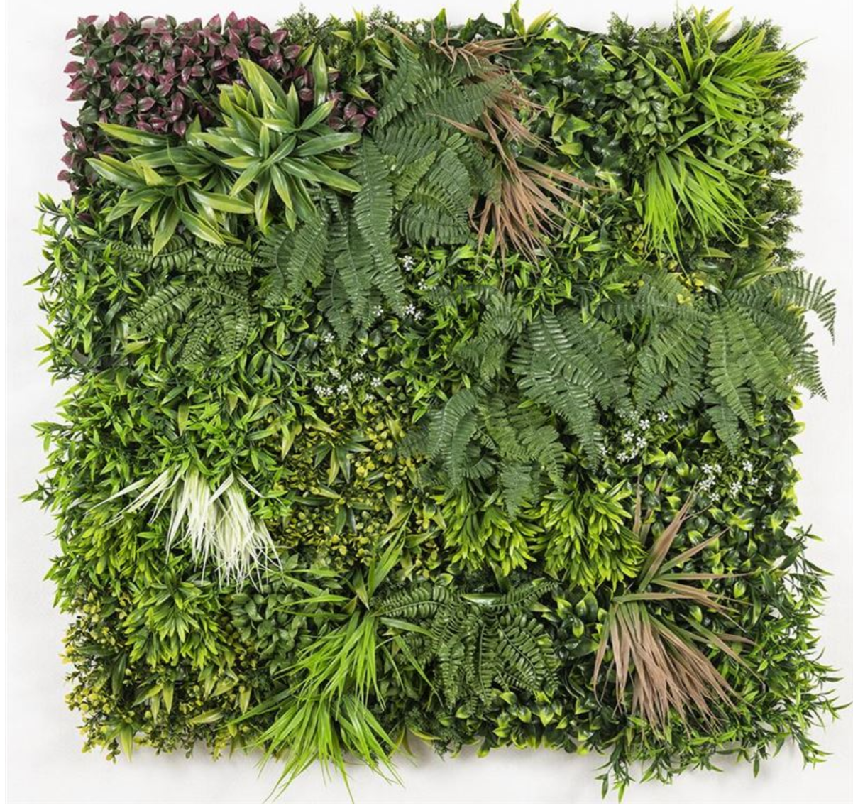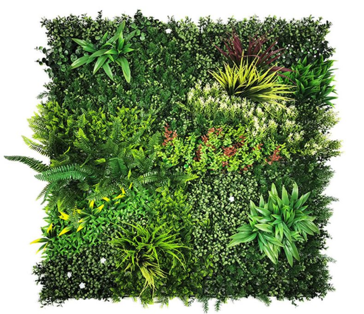Synthetic decorative panel with dense foliage, in a 1m x 1m tile. It features a three-dimensional appearance and provides a sense of vitality and naturalness to your space. Decorate your outdoor or indoor area with foliage panels and create a unique vertical garden.