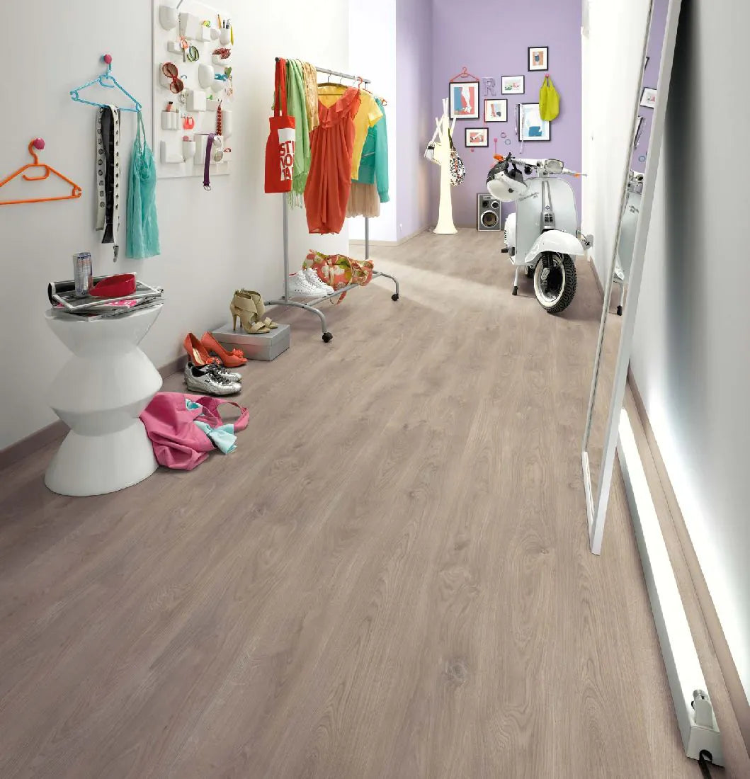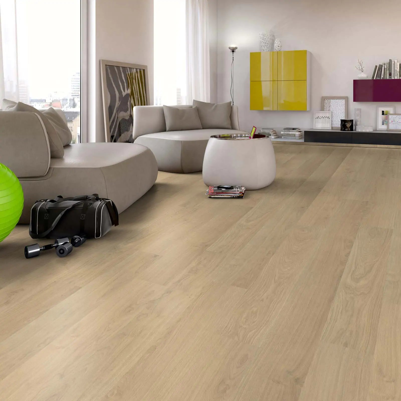 From a cosy living room to a purist loft, from a rustic dining area to an inviting hotel room: Laminate is one of the most popular types of flooring there is. And it is one of the most versatile. Due to the variety of authentic decors, from trendy solid wood optics to Scandinavian lightness and stylish elegance, the perfect design can be found for every room and interior design wish. In addition to the wide range of decors, our Laminate Flooring features high-quality workmanship and functional properties. It is robust and easy-care, flexible and quick to install. All of this at an excellent price-performance ratio.Feel the quality of our Laminate Flooring at every turn.